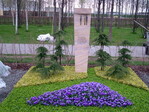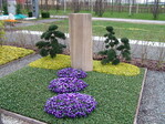 Aus Bonn machte sich Ernst-Ferdinand Timme auf den Weg nach München und holte sich mit seinen zweistelligen Wahlgrab (Bild 11) ebenfalls eine Goldmedaille. Mit seiner Gestaltung nahm Timme die Asymmetrie aus dem Grabzeichen auf und pflanzte Euonymus und Buxus als Bodendecker, Tsuga in den Rahmen und blaue Viola auf das Wechselbeet.