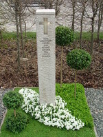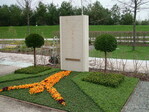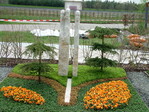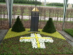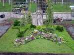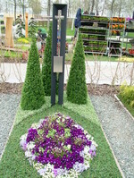 Auch nicht ganz einfach war diese schlanke Stele auf dem Urnengrab für Klaus Schittenhelm, Moers, (Bild 22). Mit Cotula als Bodendecker, Buxus im Rahmen und weißen Viola kam der Niederrheiner dennoch zum Erfolg und holte sich eine Goldmedaille.