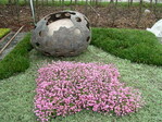 Ein verspielt wirkendes Herz, durchsetzt mit Fritillaria, die in den Bodendecker auszuwandern scheint – das ist die Idee von Konrad Herz, Gelsenkirchen (Bild 16). Wer sich an seine Arbeit aus Rostock erinnert, wird den Stil nicht auf den ersten Blick erkennen, so unterschiedlich sind diese Auffassungen. Bodendecker ist hier Buxus, den Rahmen bilden zwei Muschenzypressen. Ganz zum Ziel kam Herz mit dieser Arbeit nicht – die Jury vergab hier Silber.