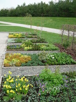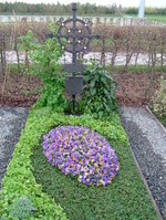 Zu guter Letzt I: Engel und Engelke, Bückeburg, pflanzten dieses Grab (Bild 23) im Bereich der historischen Grabzeichen „nur für uns“. Mit der Erfa-Gruppe waren sie mit einem Zweisteller erfolgreich, diese Mischung aus klassisch bewährend Bodendeckern wie Cotula, Cotoneaster, Buxus und Waldsteinia sowie Larix und "Muschelzypresse" im Rahmen und der Staudenvielfalt auf dem Wechselbeet brachte eine Silbermedaille ein – wenn die letzten Ecken und Kanten im Sommer ausgewachsen sind, ist vielleicht noch mehr drin, Stauden sind jedenfalls auch auf dem Friedhof nach wie vor ein aktuelles Thema.