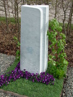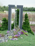 Mit der stehenden und einer liegenden Stele erwischte Berchtenbreiter, München, ein ungewöhnliches Grabzeichen (Bild 6). Mit Tsuga in der Rahmenbepflanzung, Buxus, Thymus und Cotoneaster als Bodendecker und zwei asymmetrisch angelegten Wechselbeeten mit orangen Viola gelang hier eine ansprechende Gestaltung, die auch der Jury gefiel – Goldmedaille.