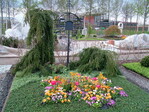 Auch hier erinnert das Wechselbeet ein wenig an einen Bachlauf oder Fluss – eine Form, die in München häufiger zu sehen ist. Rüdiger Melzner, Castrop-Rauxel, brachte diese Gestaltung nach München Mit (Bild 18). Cotoneaster und Buxus sind die Bodendecker, Kletterhortensien und kleine Farne bilden den Rahmen und auf dem frühlingshaft-frischen Wechselbeet tummeln sich Viola und Myosotis. Das kam an – Resultat: Gold.