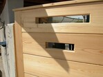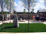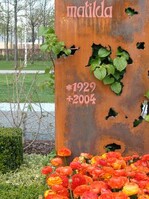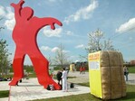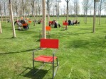 | Corten-Grabstele | Rote Stühle im Landschaftspark |