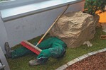 Zur Frühjahrsausstellung der Fach- und Technikerschule Veitshöchheim bewiesen die Schüler schwarzen Humor. Sie hatten einen Raum in ihrer Schule als Mustergarten gestaltet und den scheinbar verunglückten Kollegen in die Fläche integriert; als drastischen Hinweis darauf, dass vor allem Steinarbeiten nur von Profis ausgeführt werden sollten.