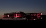 Die Lichtgestaltung von Herbert Cybulska machte die Aussichtsplattform in der Nacht durch die Hervorhebung der Bauwerkskanten in strahlendem Weiß sichtbar und zu einem visuellen Orientierungspunkt in dem weitläufigen Park. BUGA/Red