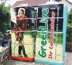 „Baustellen-Toiletten sind als solches ja nicht der Hit“, fand Andreas Raisch von „Greenlive“ aus Gotha. Und da das Aufhängen von Gerüstplanen an umfallgefährdeten Bauzäunen sich auch nicht recht bewährt hatte, sagte sich der junge Unternehmer: 1 + 1 = 2. Dazu kam: Die Mindestmiete für kleine Bauvorhaben war zu lang. Da amortisiert sich die eigene Toilette schnell. Die kostet mit Beklebung ( http://www.kleben-ist-unser-leben.com ) gut 1000 € und kann schnell von Hausgarten zu Hausgarten verfahren werden. Greenlive hat mittlerweile eine in rot und eine in blau. „Manche Stammkunden fragen schon danach, welche Toilette diesmal kommt“, meint Raisch schmunzelnd.