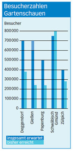 Papenburg liegt voll auf Linie. Zum Bergfest am 18. Juli hatten die Niedersachsen rund 240000 Besucher. Die bis zum 19. Oktober erwarteten 500000 sollten also leicht zu erreichen sein, zumal die zweite Hälfte in der Regel bei Gartenschauen die stärkere ist. „Wir sind sehr zufrieden!“, kommentierte Imma Schmidt von der Presseabteilung das Halbzeitergebnis.