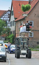 GaLaBau-Unternehmer Tobias Zipperlen aus Weissach ( http://www.zipperlen-gartenbau.de ) ließ es sich nicht nehmen, ein befreundetes Paar am Hochzeitstag in einem Cabrio der besonderen Art durch den Ort zu fahren. Auf die Gabel seines Radladers stellte er eine Holzpalette, darauf eine Holzbank für die frisch Vermählten. Kein Sitzplatz ohne Pflanzen – eine Catalpa und einige Lavandula sorgten für Gartenambiente in luftiger Höhe. Bräutigam Michael Killgus ist übrigens ein Bruder des DEGA-Redakteurs Christoph Killgus, die Braut Annette (geb. Conrad) Landschaftsarchitektin aus Frankfurt – irgendwie schließt sich der Kreis doch immer wieder.
