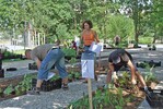 Die Landschaftsarchitektin Christine Orel bei der Pflanzung ihres Treibholzgartens für die LGS Rosenheim 2010. Mit ihrem Entwurf für die ungewöhnlichen Staudenbänder wurde sie unter vier Vorschlägen von Landschaftsarchitekten ausgewählt. Geliefert und gepflanzt haben bayerische Staudengärtner der Staudengruppe Süd, wie die Staudengärtnereien Augustin, Panitz, Haid und Klose-Dichte, sowie der Bamberger Staudengarten. PR