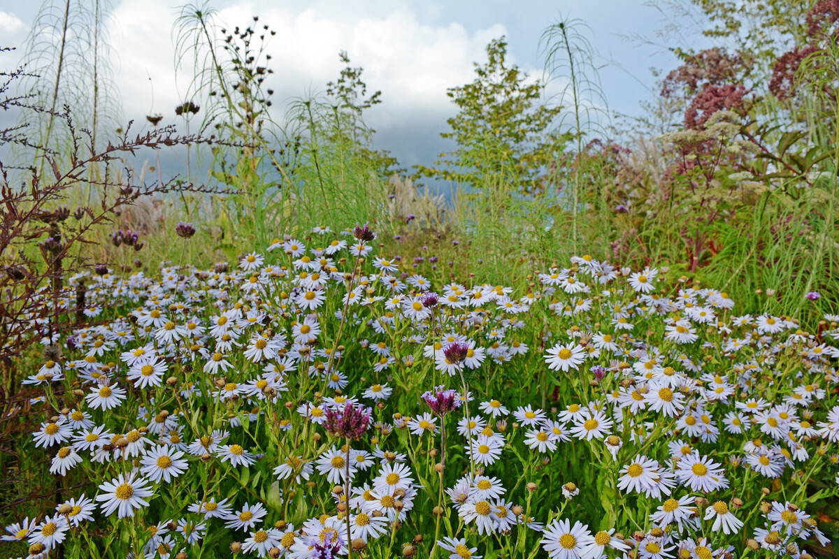 Mit zahllosen Sternenblüten sorgt die unkomplizierte Schönaster für wochenlange Pracht ab dem Hochsommer und für eine Insektenweide. Die früher als Unterart der Aster geltenden Stauden findet sich in gut sortierten Staudenbetrieben.