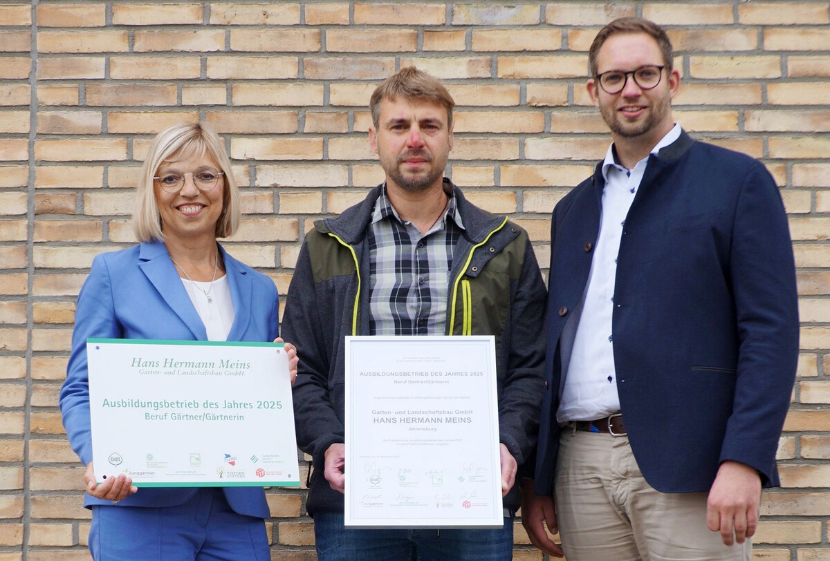Die Ahrensburger Hans Hermann Meins GaLaBau GmbH wurde bei der landesweiten Freisprechungsfeier in Neumünster zum „Ausbildungsbetrieb des Jahres 2025 im schleswig-holsteinischen Gartenbau“ gekürt. Die Auszeichnung wird von der Landwirtschaftskammer gemeinsam mit grünen Berufsverbänden, der Wirtschaft und der Gewerkschaft vergeben.