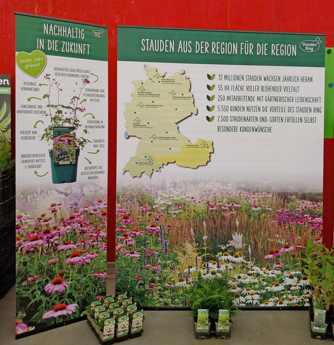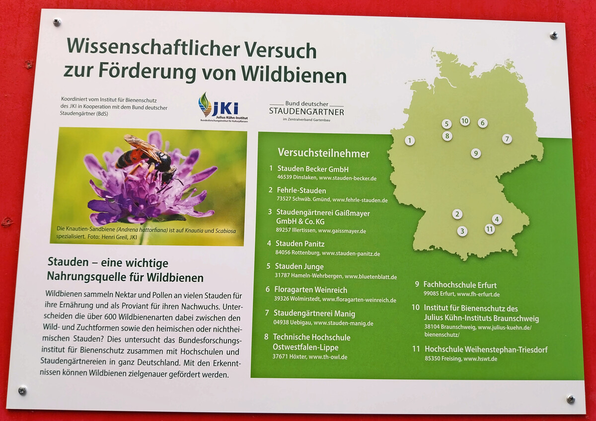Ein Poster informierte über ein Forschungsprojekt unter Leitung des Julius Kühn-Instituts und des Bunds deutscher Staudengärtner, in dem es um die Frage geht, ob und in welchem Maß Zuchtformen und Auslesen von Stauden im Vergleich zu den natürlichen Arten Nahrung für Wildbienen bieten können. An diesem Projekt sind mehrere Hochschulen und Staudengärtnereien, darunter Fehrle, beteiligt. Im nächsten Jahr werden die Ergebnisse erwartet.