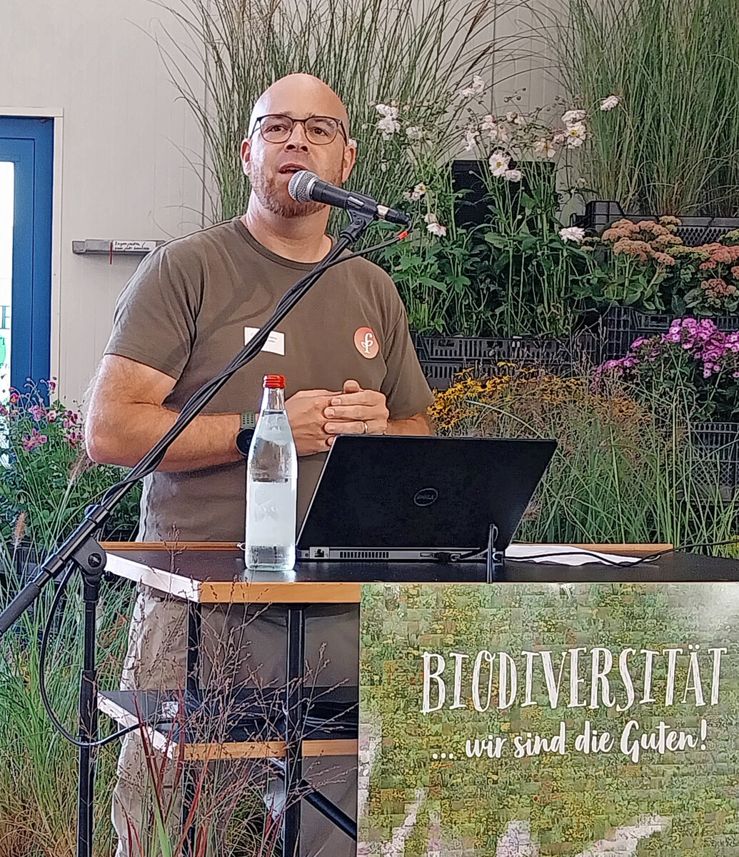 Auch der zweite Referent, Gartengestalter Andreas Wiedmaier aus Freiburg, stimmte hier zu. Er hatte neben zahlreichen Pflanzen- und Gestaltungsempfehlungen Tipps zur Beratung von Kunden parat, zum Beispiel. „Die Kunden kennen oft nur fünf Pflanzen. Wenn sie die in ihrem Garten wünschen, heißt das nicht, dass sie genau die wollen. Wenn ich denen sage, an dem Standort funktionieren und blühen andere Arten besser, war das noch nie ein Problem.“