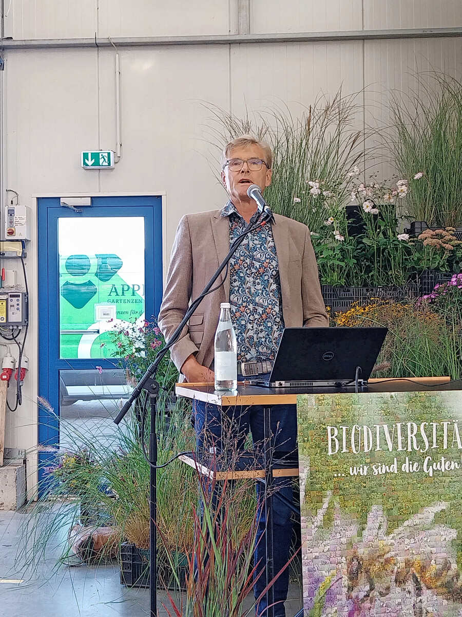 Bei herrlichem Sommerwetter fanden sich Vertreterinnen und Vertreter von Kommunen, GaLaBau-Betrieben und des gärtnerischen Einzelhandels auf dem blühenden Betriebsgelände ein. Das Team von Fehrle Stauden hatte die Veranstaltung bestens vorbereitet und sorgte für eine sehr angenehme Atmosphäre. Chef Christoph Hokema würdigte dies gleich zu Anfang und dankte seiner Belegschaft – eine schöne Geste -, denn er war zuvor mehrere Wochen nicht im Betrieb gewesen. Auch gratulierte und dankte er den Betriebsjubilaren, die Jahrzehnte für den Erfolg des Unternehmens gearbeitet haben. Die zahlreichen Auszubildenden, die die Kunden mitgebracht hatten, durften nach der Begrüßung mit den Fehrle-Azubis „verschwinden“ – für sie war ein eigenes Lehrprogramm und die gemeinsame Pflanzung eines faunafreundlichen Staudenbeets vorgesehen.