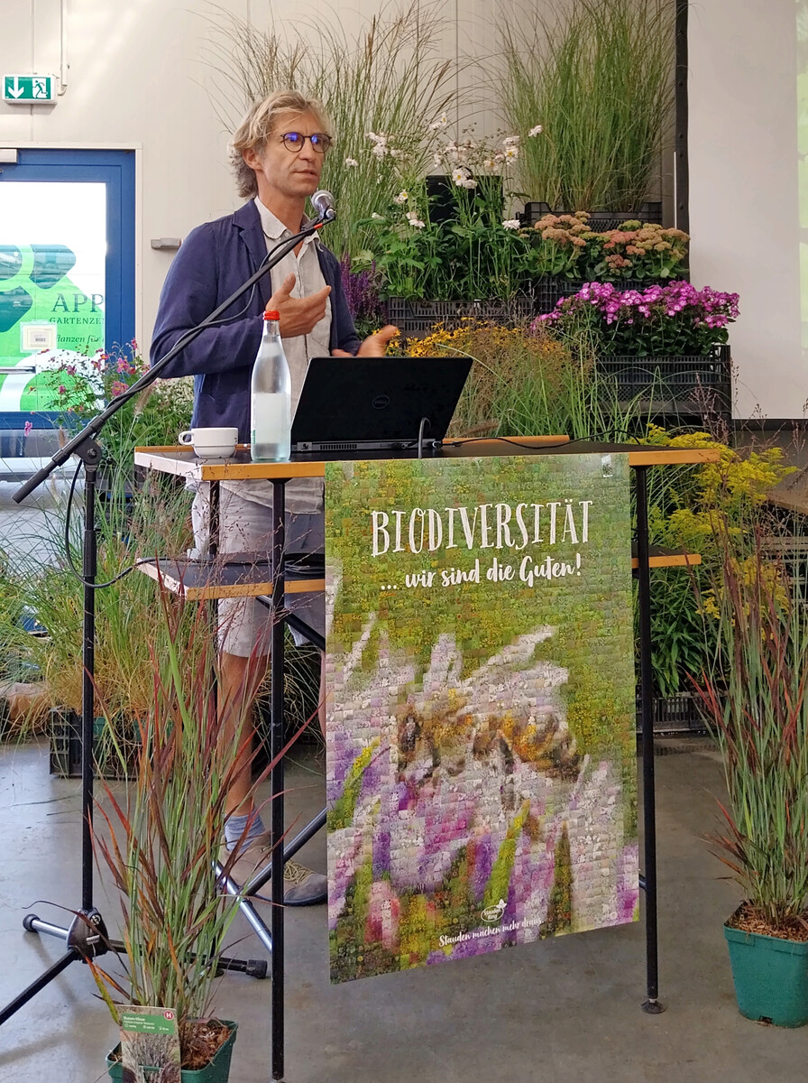 Zwei Vorträge begeisterten das Publikum; sie wurden von zwei Frauen in Gebärdensprache übersetzt. Till Hofmann, Inhaber einer Staudengärtnerei in Rödelsee, Referent und Autor, sprach über die Anlage und Pflege naturnaher Pflanzungen auf Basis natürlicher „Vorgaben“: dem Stockwerksaufbau aus Wurzel-, Kraut-, Strauch- und Baumschicht, der Geselligkeitsstufen und der Dynamik. In der Natur entwickele sich alles Richtung Wald. „Für uns Gärtner ist es wichtig zu wissen, wo wir stehen und wo wir hinwollen“, betonte Hofmann. In der Regel wollen wir die Staudenphase erhalten; unsere Aufgabe sei es, dahingehend die Dynamik zu erkennen und einzugreifen. „Für den Boden und das Wurzelsystem haben wir Gärtner uns viel zu lange kaum interessiert“, sagte er. Die Mutter allen Übels sei die Verdichtung des Bodens.