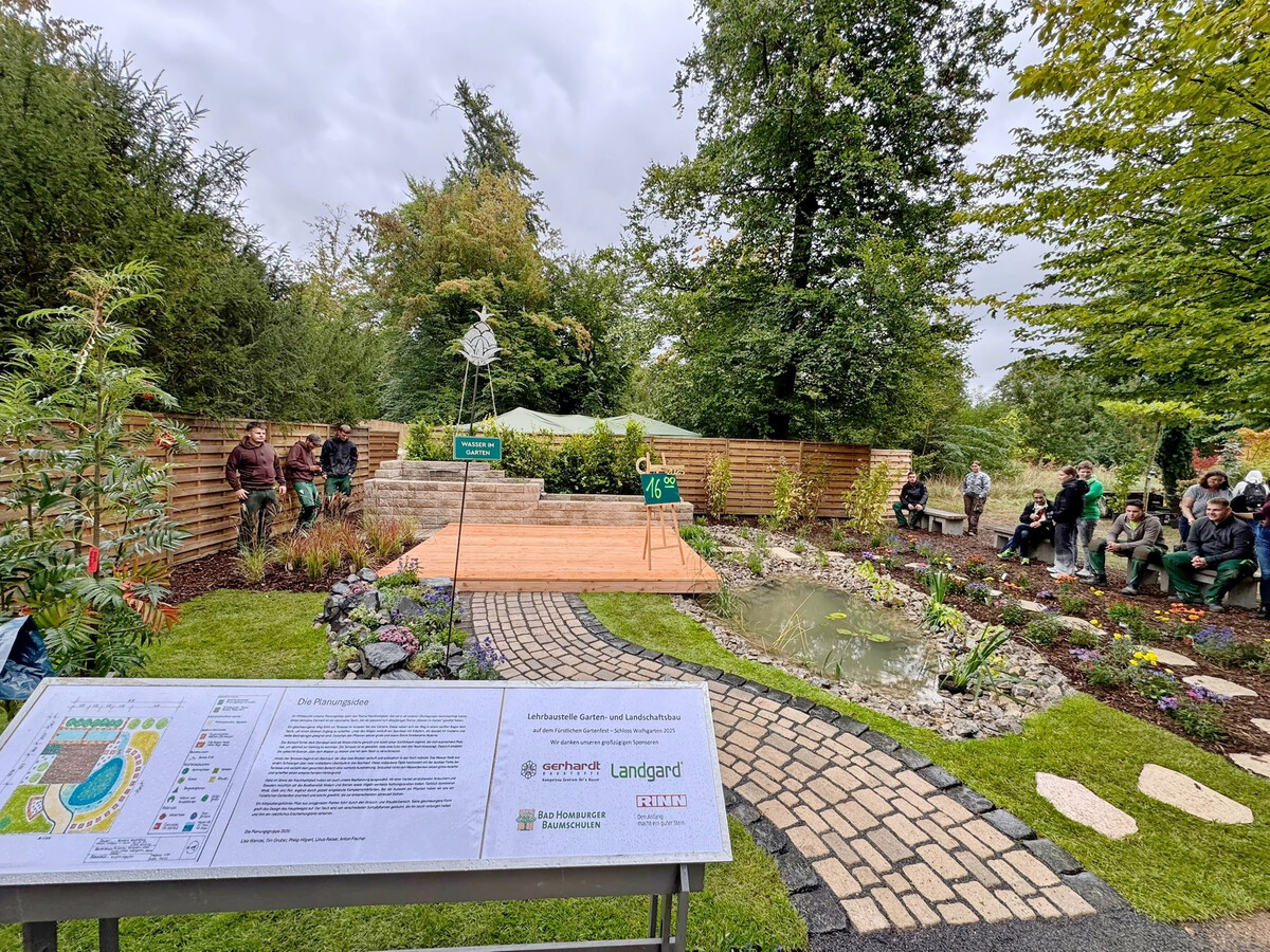 von FLG/Redaktion Quelle FGL Hessen-Thüringen erschienen am 30.09.2025Der Fachverband Garten-, Landschafts- und Sportplatzbau Hessen-Thüringen (FGL) unterstützte in diesem Jahr erneut die traditionelle Lehrbaustelle der Philipp-Holzmann-Schule Frankfurt am Main auf dem Fürstlichen Gartenfest im Schloss Wolfsgarten in Langen. Vom 19. bis 21. September setzten über 30 Auszubildende das Sonderthema „Wasser im Garten“ um und verwandelten in nur drei Tagen einen leeren Bauplatz in einen naturnahen, modernen Schaugarten. Zahlreiche GaLaBau-Betriebe, Sponsoren sowie engagierte Lehrkräfte und AusbilderInnen unterstützten die erfolgreiche Realisierung des Projekts.
