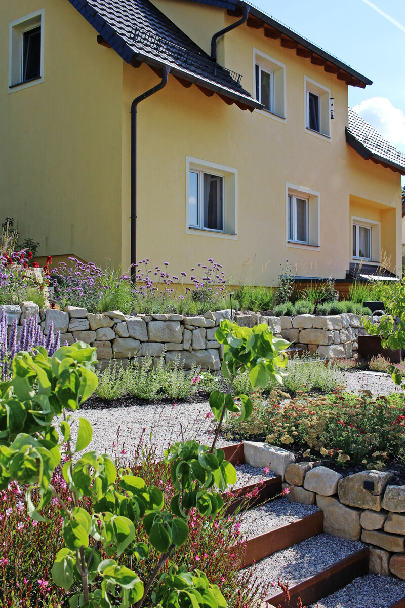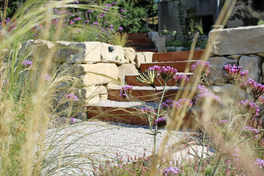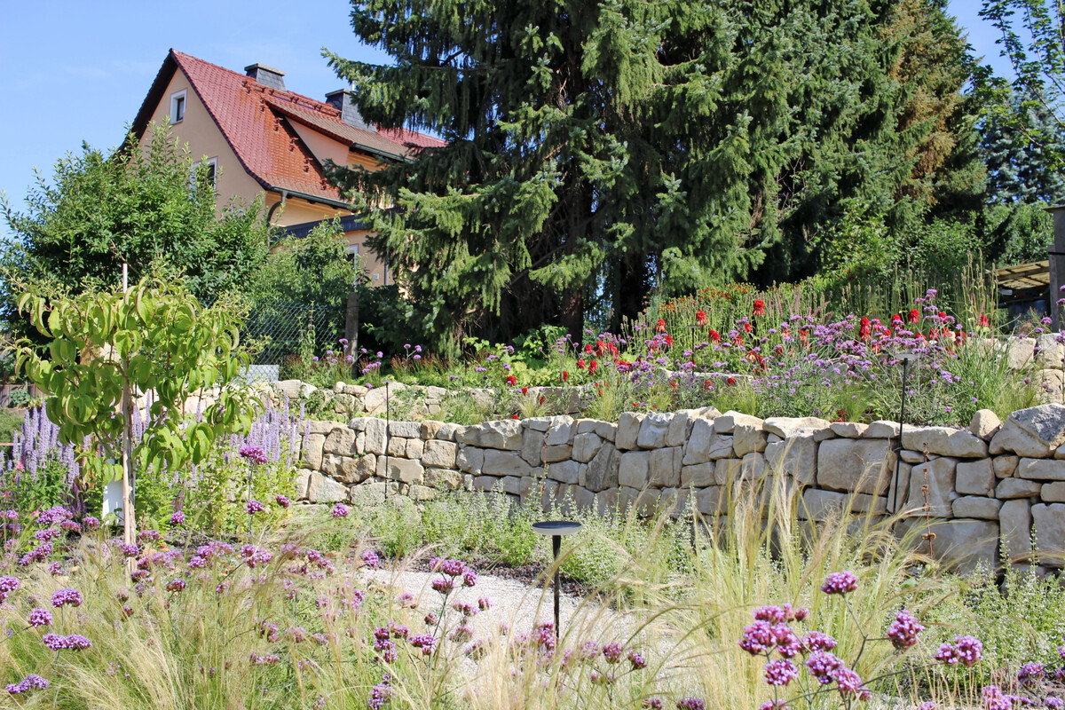 In den Süptitzer Höhen (Gemeinde Dreiheide, Landkreis Nordsachsen) wurde ein ehemaliger Weinberghang von der Firma „Dein Gartenraum Steffen Langbein“ in einen ökologisch wertvollen und zugleich gestalterisch anspruchsvollen Naturgarten verwandelt. Die Grundstückseigentümer, eine Imkerfamilie, wünschten sich eine bienenfreundliche Umgestaltung des steilen, unzugänglichen Vorgartens. Umgesetzt wurde ein Hanggarten, der Lebensraum für Mensch und Natur schafft. Mit Trockenmauern aus regionalem Sandstein, komplett ohne Beton, naturnaher Bepflanzung, Wasserspiel und durchdachter Beleuchtung entstand auf schwierigem Terrain ein lebendiger, nachhaltiger Gartenraum. Die Jury verleiht einen Sonderpreis für das sensibel umgesetzte Gesamtkonzept, den ressourcenschonenden Materialeinsatz und die vorbildliche Verbindung von Funktionalität, ökologischer Verantwortung und gestalterischer Qualität.