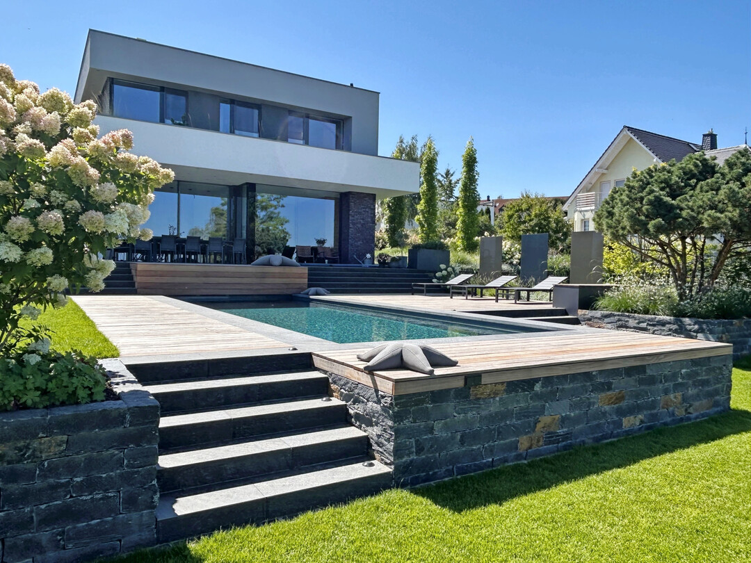 Das Projekt „Vielfalt in Räumen – von der Brache zum Traumgarten“ verwandelte eine ehemalige Gärtnereifläche in Dresden-Gompitz in einen modernen, naturnahen Familiengarten mit beeindruckendem Höhenversatz von über 4 m. Entstanden ist ein formal gegliederter, zugleich lebendiger Garten mit Naturpool, Spiel- und Ruhezonen, artenreicher Bepflanzung sowie nachhaltiger Wasser- und Lichttechnik. Natursteinmauern, hochwertige Materialien und mehr als 3.000 Stauden schaffen einen vielfältigen, ökologisch wertvollen Lebensraum – funktional, ästhetisch und familiengerecht. Die Jury vergibt einen Sonderpreis für die herausragende gestalterische und handwerkliche Qualität, die konsequente Nachhaltigkeit sowie das perfekte Zusammenspiel von Architektur, Landschaft und Nutzung.