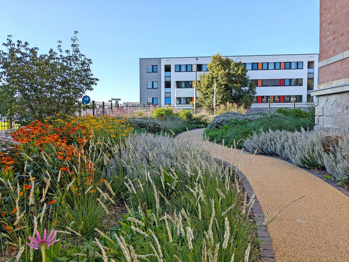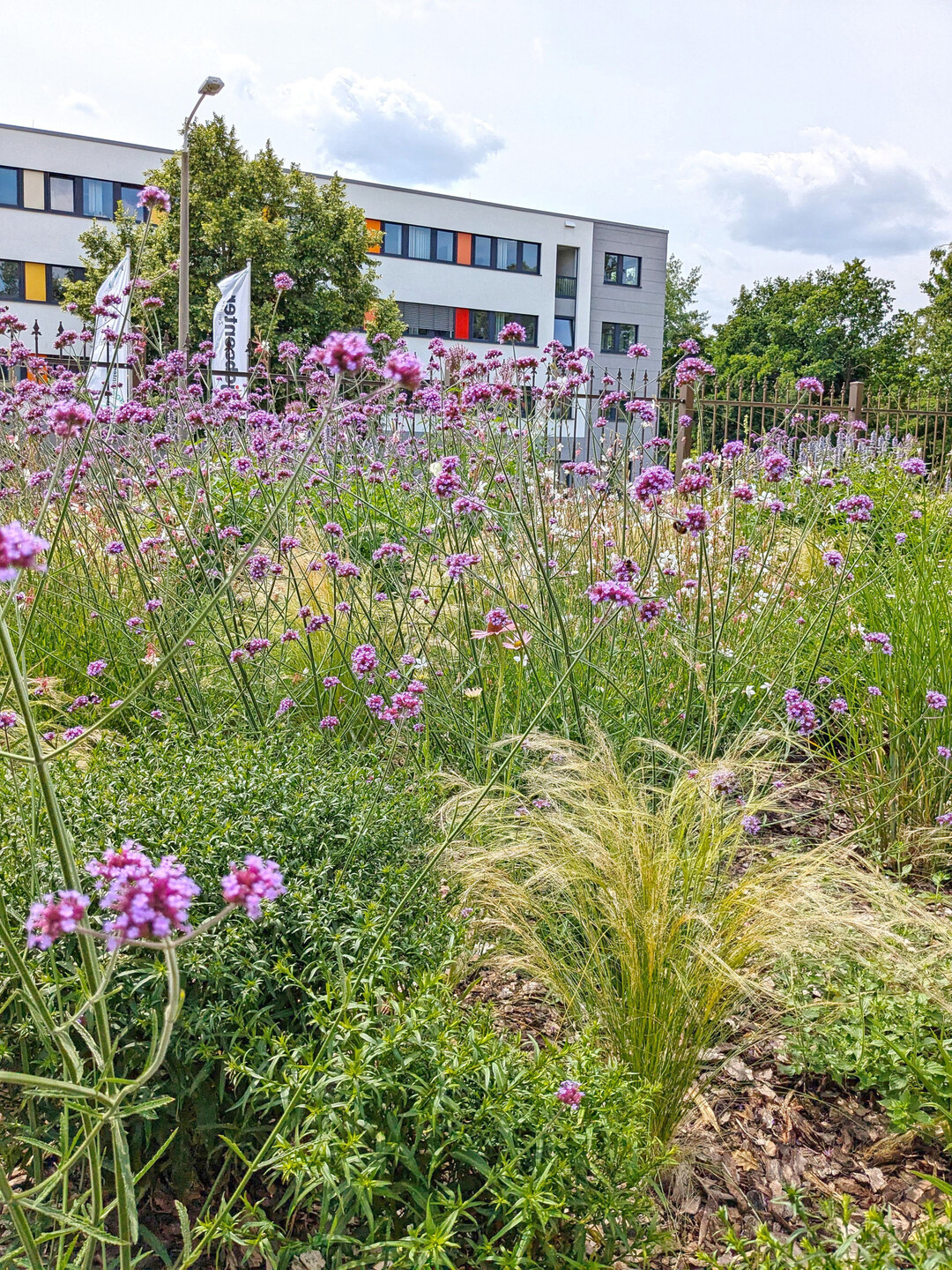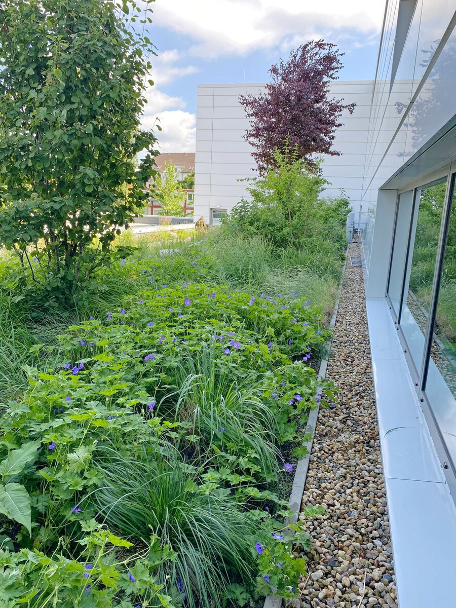 Mit dem Projekt „Dachterrasse Fraunhofer-Institut FEP“ ist ein herausragendes Beispiel dafür gelungen, wie ein technisch komplexer Forschungsstandort mit einem qualitätsvollen, naturnahen Freiraum verbunden werden kann. In 7 m Höhe entstand ein intensiv begrünter Dachgarten, der sowohl den Mitarbeitenden als Rückzugsort dient als auch Lebensraum für Pflanzen und Insekten schafft. Trotz hoher statischer Anforderungen und sensibler baulicher Rahmenbedingungen wurde ein funktional durchdachter, gestalterisch präziser Freiraum realisiert, der sich mit artenreicher Bepflanzung, hochwertigen Materialien und automatischer Bewässerung zeigt.