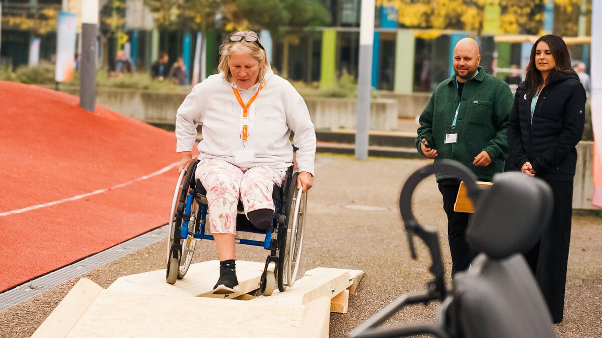 1Einen Perspektivwechsel der besonderen Art bot der große Außenparcours, auf dem neu entwickelte Spielgeräte ausprobiert werden konnten. Ob Blindenparcours, rollstuhlgeeigneter Pumptrack, modulare Kletter-Balancier-Anlage, Inklusionssitze oder das bewegliche Klettergerät „Tumultix“ – hier wurde das Zusammenspiel von Risiko, Herausforderung und Inklusion erlebbar. Fachleute aus unterschiedlichen Bereichen testeten selbst, diskutierten Materialien, Fallhöhen und Spielwert – und kamen miteinander ins Gespräch. Das Gelände bot Raum für Beobachtung, Austausch und praxisnahe Reflexion aus Sicht aller Beteiligten.
