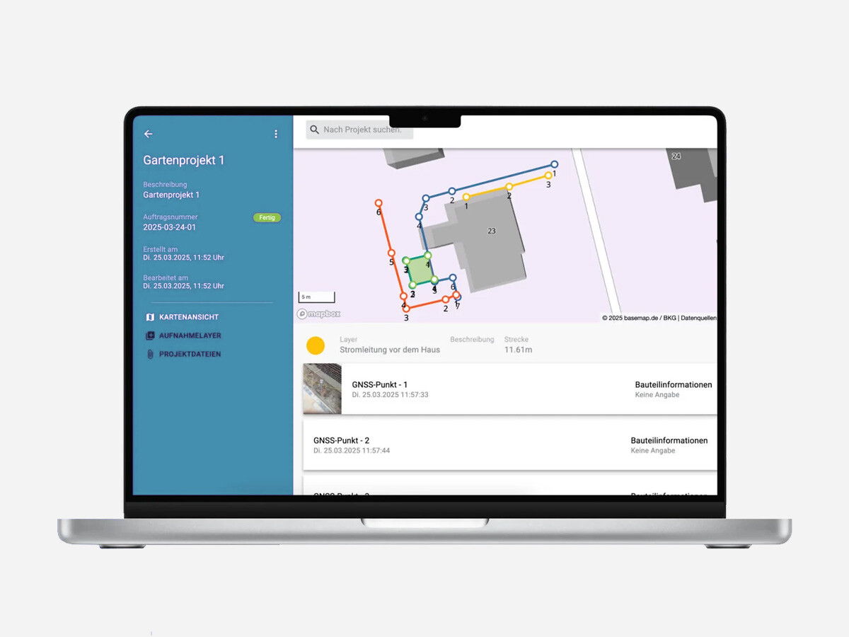 - Messen: 3tag-Hardware einschalten, mit der App verbinden und Punkte, Linien oder Flächen direkt im Gelände erfassen.