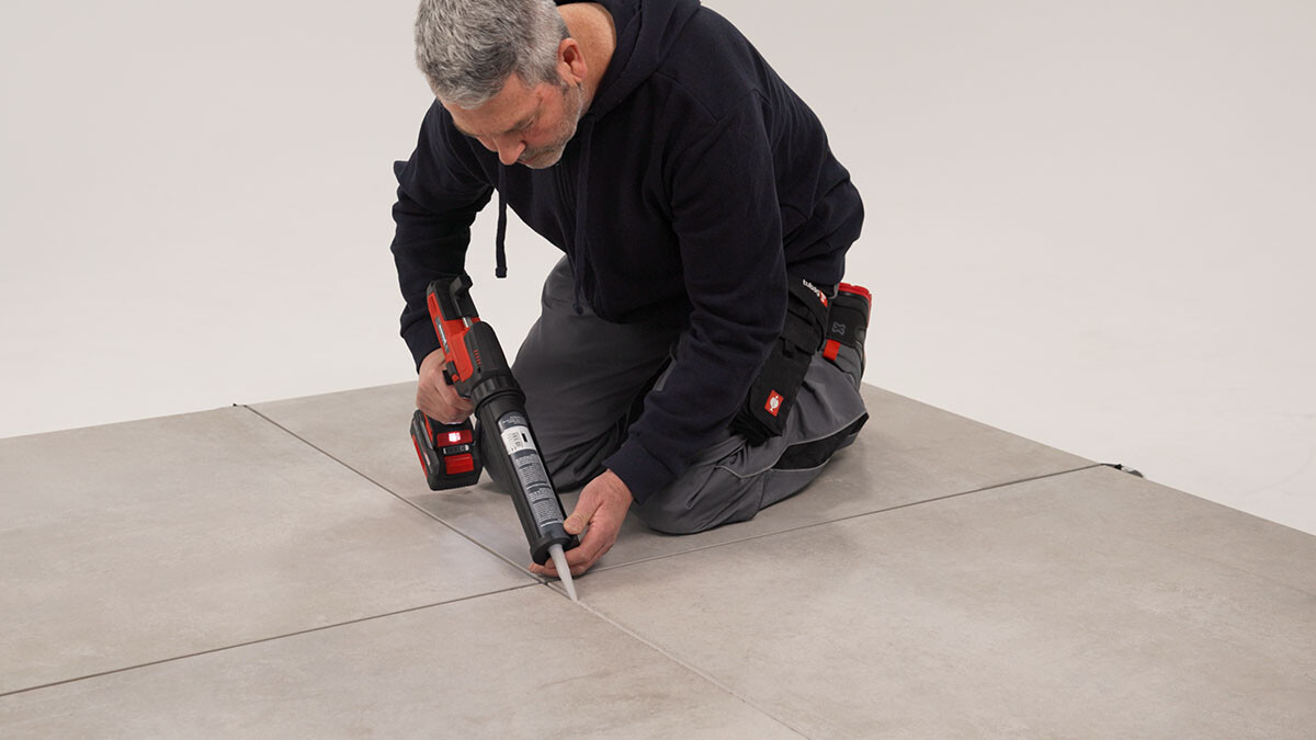 - Verfugen von auf Stelzlager- und Schienensystemen verlegten Platten