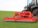Vorgesehen ist die Terra Rake zum Einsatz am Heck-Dreipunkt von Kompakttraktoren. Die hohe Fahrgeschwindigkeit von 10 bis 15 km/h versetzt die mehrreihig im Parallelogramm angeordneten Vertikutierzinken derart in Schwingung, dass sie den Filz kraftvoll aus der Grasnarbe ziehen: Ein sauberes Arbeitsergebnis ist die Folge. Die Arbeitstiefe lässt sich bei der Terra Rake über Laufrollen millimetergenau einstellen. Ein Strichabstand von 16 mm zwischen den Zinken soll Verstopfungen effektiv vermindern. Den herausgearbeiteten Filz legt die Maschine oberflächig ab. Die beiden Vertikutierausleger der neuen Modelle fahren hydraulisch in die Transport- oder Arbeitsstellung, was die Handhabung erleichtert.