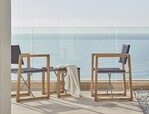 Zwei Teakholzwangen und ein Edelstahlkreuz tragen die schlanke Konstruktion. Armlehnstühle und Hocker lassen sich leicht zusammenklappen und platzsparend verstauen.