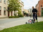 Der Cramer 82V Dual-Akku-Mäher ist äußerst handlich. Dazu trägt das geringe Gewicht von 26,5 kg ohne Akku, die verstärkten Achsen mit doppelt-kugelgelagerten Leichtlaufrädern und nicht zuletzt der für Dauergebrauch ausgelegte ergonomisch geformte Vollklapp-Holm mit 3-Positionen-Arretierung bei. Das erleichtert den Einsatz an schwer erreichbaren Stellen. Der Anfahrschutz dient gleichzeitig als Tragegriff für schnelles Be- und Entladen.