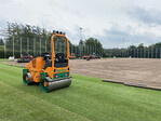 Bei der Verlegung von Rollrasen auf den Trainingsplätzen in Osnabrück hat die neue Tandemwalze ihre Platztaufe bravourös bestanden. Sie wurde eingesetzt, um den neu verlegten Rollrasen zum Schluss optimal anzudrücken. Der Rollrasen des 100 m x 50 m großen Spielfeldes wurde an nur einem Tag verlegt. Zufrieden streicht Prokurist André Kastigen mit der Hand über das weiche Gras des neuen Platzes. Sein Fazit: „Die Bahnen liegen absolut plan. Da rollt der Ball.“