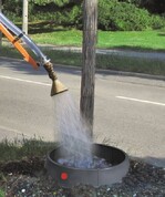 Der arboGreenWell ist oben über die gesamte Fläche offen und passt so genau in diese Entwicklung: Er lässt er sich direkt vom Gießfahrzeug aus selbst mit einem Brausekopf füllen, der der Flächenbewässerung dient. So können Flächen und Einzelstandorte frisch gepflanzter Bäume in einem Arbeitsgang bewässert werden. Auch das spart zusätzlich Einsatzzeiten. Bei den Wassersäcken ist durch die Abdeckklappe und enge Öffnung die automatische Befüllung vom Fahrzeug aus prinzipbedingt nicht möglich.
