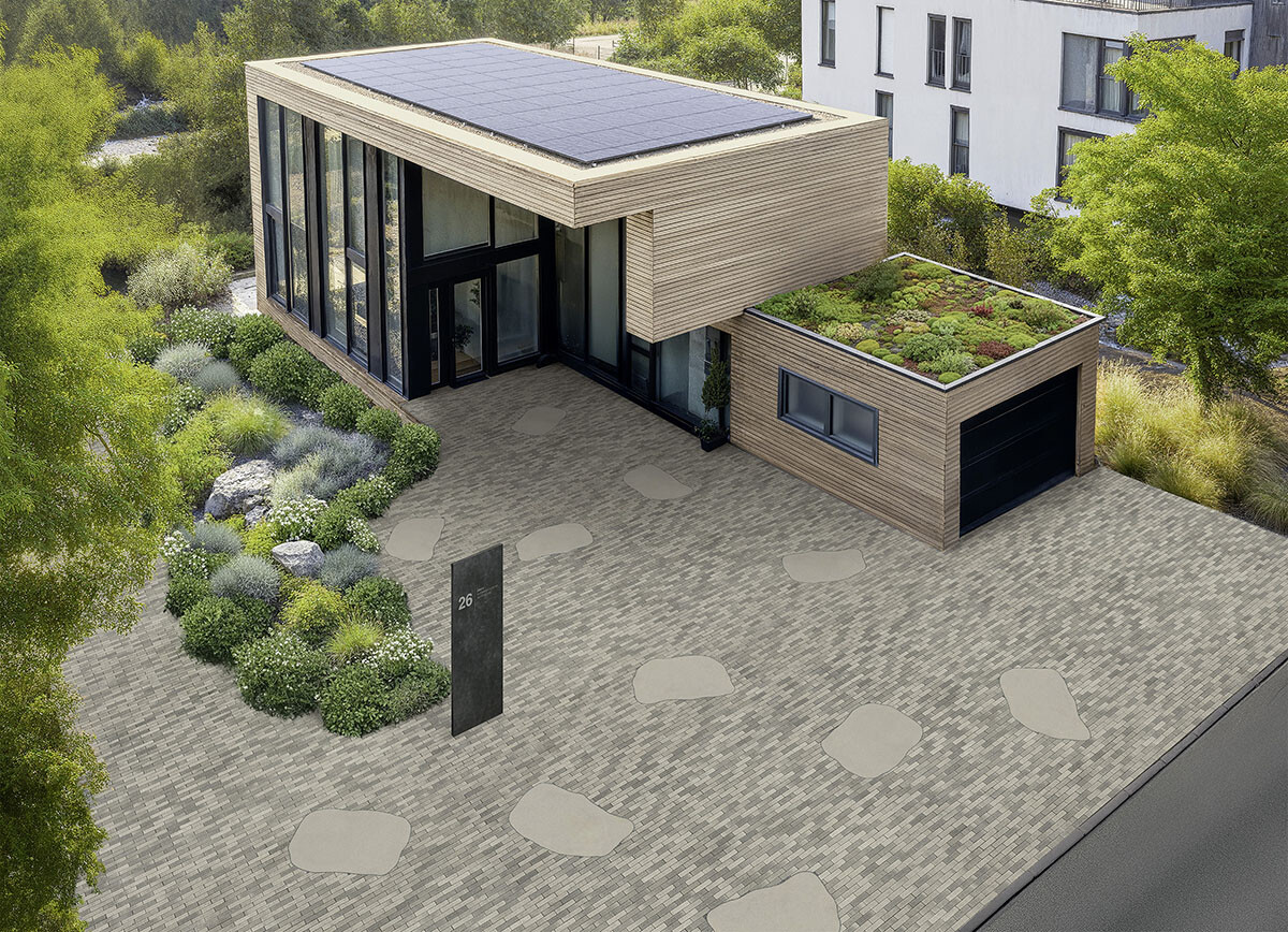Während das klassische ARENA-Pflaster lebendige, wasserdurchlässige Beläge mit hohem Fugenanteil erzeugt, verleiht ARENA GRANDE den Flächen eine prägnante, eigenständige Struktur. In Kombination mit linearen Formaten wie dem MAURINO Riemchenstein entstehen spannungsreiche Belagsbilder, in denen organische Formen und klare Linien bewusst miteinander kontrastieren.