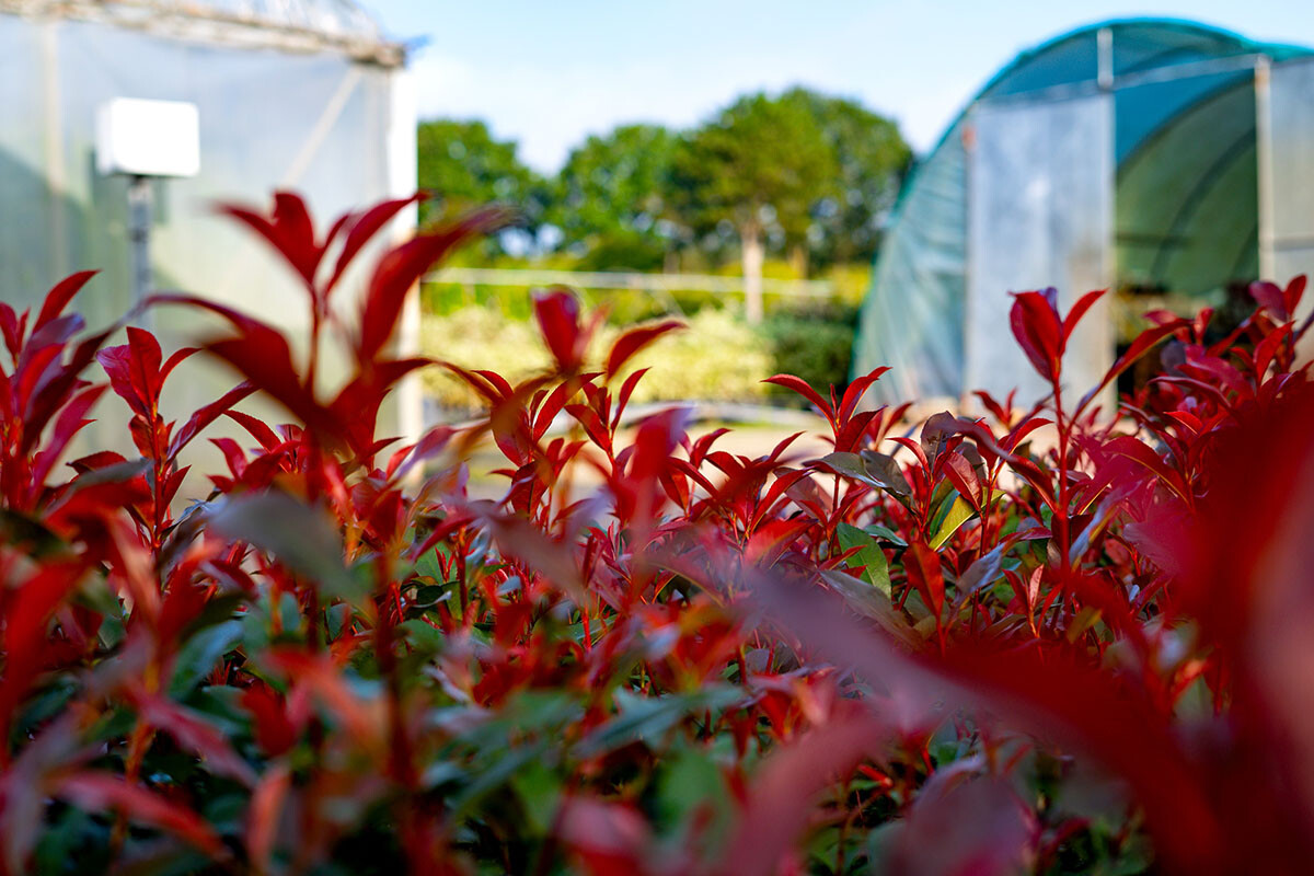 Ein weiterer Vorteil liegt in der guten Verzweigung, die zu einem schnellen Aufbau einer aufrechten, blickdichten Hecke führt. Obwohl Photinien generell als strukturstark gelten, zeigt ‚Devils Dream‘ hier eine sichtbar dichtere Verzweigung, die sowohl die Kultivierung als auch die spätere Pflege beim Endkunden erleichtert. Die Sorte ist winterhart, zuverlässig im Wuchsverhalten und zugleich sehr schnittverträglich – ein Punkt, der insbesondere für das Gartencenter von Bedeutung ist, denn jede Schnittmaßnahme regt neuen roten Austrieb an. Ein Rückschnitt im Frühjahr schafft die Basis für einen neuen Austrieb, ein leichter Formschnitt bis Juni verstärkt den Farbeffekt zusätzlich. Grundsätzlich sollte der letzte Schnitt wie bei immergrünen Laubhecken üblich bis spätestens August erfolgen, damit die Triebe ausreifen und sicher in den Winter gehen können.