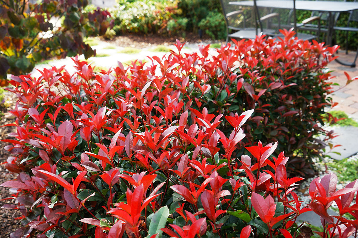Die roten Austriebe heben sich hervorragend von den dunkelgrünen Blättern ab und sorgen für eine hohe Wiedererkennbarkeit als Hecke, als Solitär im Beet und als Kübelpflanze.