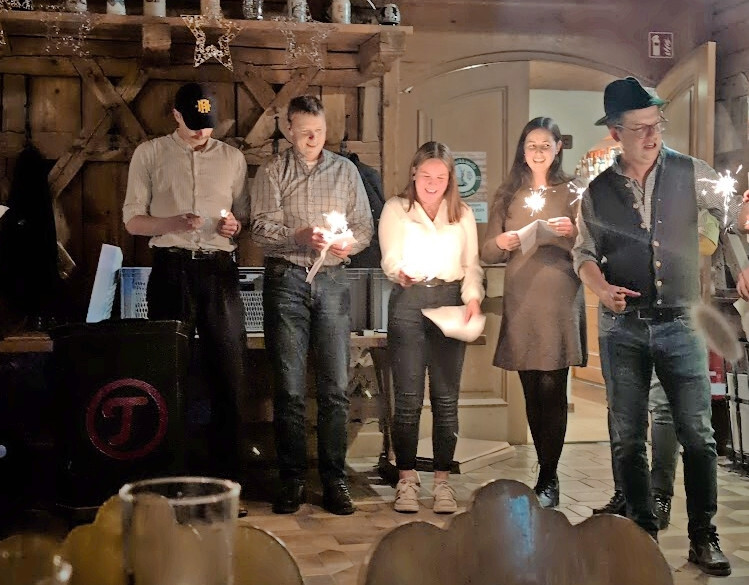 Für unsere Mitarbeiter gibt es eine Weihnachtsfeier, Dankesrede, Ehrungen für Betriebstreue oder Abschiede. Zur Weihnachtsfeier gibt es auch unsere Fotobücher, wo unser Firmenjahr mit Ausflügen, Messen, Projekten und auch Lustigem gefüllt ist – einfach gemeinsam das Jahr schön ausklingen lassen. Letztes Jahr hatten wir als Überraschung eine Theatergruppe bei uns. Auf dem Foto ist die Gesangseinlage aller neuen Kollegen, ist jedes Jahr sehr schön. Nach der Weihnachtsfeier haben wir bis Heilige drei Könige geschlossen.