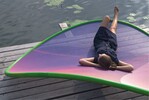 Einfach, aber genial – der „Shallow Swing“ des Holzkünstlers Gisbert Baarmann aus Templin. Die großzügigen, mit Stoff bespannten Holzrahmen erinnern an Blütenblätter. Die mit flachem Schwung versehenen Holzrahmen werden in Handarbeit aus Einzellamellen wetterfest verleimt. Die textile Bespannung stabilisiert durch ihre Sattelform, einem hyperbolischen Paraboloid, den Rahmenring. Es entsteht ein leichtes, formstabiles und dennoch elastisches, transparentes Gebilde, das zum entspannten Liegen und leichtem Wiegen ebenso taugt wie als Sonnenschutz – und ganz nebenbei auch noch toll aussieht.