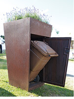 Mit dem Müllschrank „evanu" von exTDeco verschwindet der Müll im durchdachten Pflanzkübel. Der Behälter ist in zwei Größen erhältlich: S für 120-l-Tonnen und L für 240-l-Tonnen. Der Schrank ist mit einer Kippvorrichtung und Magnetverschluss ausgestattet. Er wird aus Cortenstahl, Edelstahl oder pulverbeschichtetem Aluminium hergestellt – auf Wunsch auch als Doppelschrank.