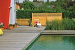 Die Firma Osmo im münsterländischen Warendorf hat ein neues Sichtblendensystem aus dem tropischen Garapa-Holz (Apuleia leiocarpa) auf den Markt gebracht. Durch seine unterschiedliche Oberflächenstruktur (genutet, glatt) sind die Bella-Vista-Elemente beidseitig einsetzbar.
