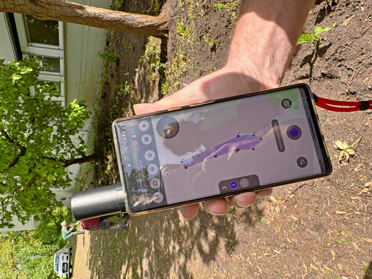 1Die Berliner nutzen 3tag zum schnellen und digitalen Aufmaß (±2?cm Genauigkeit) – GNSS, Cloud, Basiskarten und Bauteilkataloge inklusive. So wurden für die Flächenerfassung eines neu zu bepflanzenden Bereichs die Eckpunkte mit der 3tag-App und der GNSS-Antenne am Smartphone (Hardware-Komponente) eingemessen – Punkt für Punkt. Eine manuelle Schließung der Fläche war nicht erforderlich: Das System schließt automatisch die Fläche, durch Verknüpfung von Start- und Endpunkt. Selbst eine schwierige Stelle, bei der ein Teil der Fläche direkt an ein Gebäude grenzte, konnte erfolgreich erfasst werden. So spart das Team wertvolle Zeit – ohne Kompromisse bei der Genauigkeit.