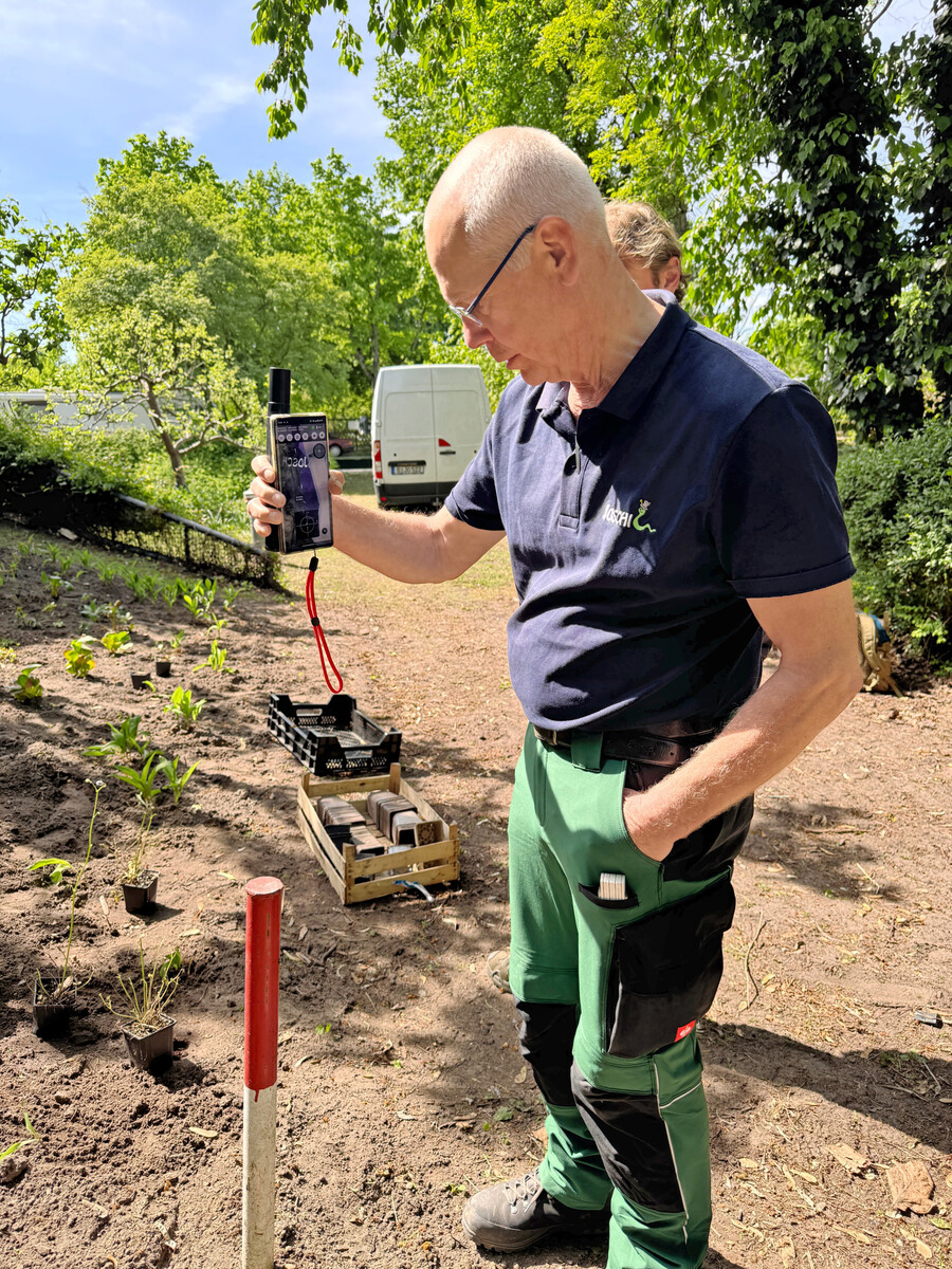 2Nach der zuvor digital erfassten Fläche suchte das Team von Joschi gezielt einzelne Messpunkte wieder auf. Die Auswahl erfolgte direkt in der App – diese zeigt in Echtzeit an, wie weit man vom Zielpunkt entfernt ist. Sobald man sich dem Punkt nähert, unterstützt ein Fadenkreuz bei der exakten Verortung. Das akustische Signal bestätigt schließlich die erfolgreiche Absteckung – zuverlässig ohne Umwege, ohne Vermutungen.