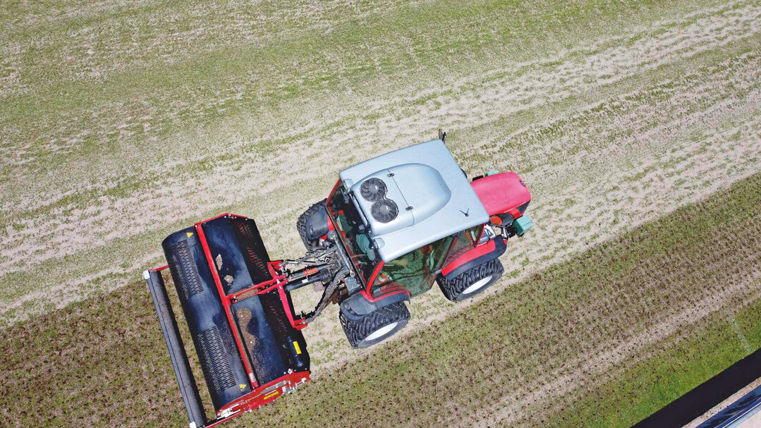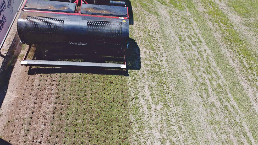 Auf dem Programm für den Bereich standen ferner: kurz mähen des Rasens, vertikutieren, striegeln, mit Hohlspoons 160 mm aerifizieren, besanden und einkehren. Dann wurde der Bodenhilfsstoff eingebracht und eine zweite Tiefenlockerung vorgenommen, um den Stoff in den Wurzelraum der Sode einzukehren.