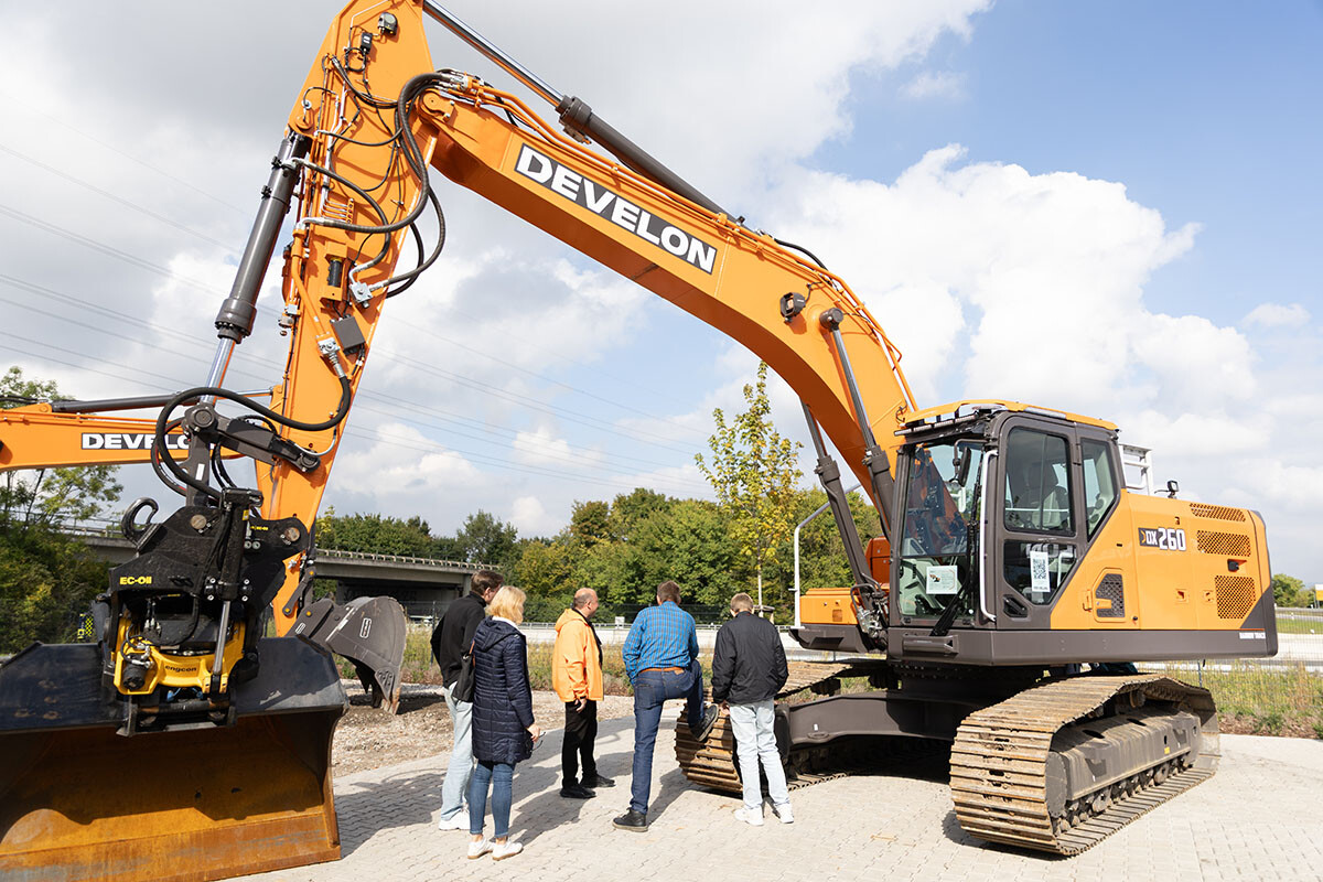 Die inzwischen 18 Mitarbeitenden und acht Service-Techniker informierten über die Maschinen und ihre Features, boten Gelegenheit zum Probesitzen und teils auch zum Testen. Das absolute Highlight waren, wie erwartet, die beiden Kettenbagger DX230LC und DX260LC der -9er-Serie. „Diese neue Maschinenserie stellt einen Quantensprung gegenüber der Vorgängerserie dar. Die Maschinen sind hocheffizient und intelligent digitalisiert“, erläuterte Andreas M. Lohner, Geschäftsführer Deutschland und Vertriebsleiter für die DACH-Region. Der DX230LC zog allerdings aus einem weiteren Grund alle Blicke auf sich: Nach ihrer Europa-Premiere wenige Tage zuvor in Frankreich konnte der mit E-Stop ausgestattete Bagger zum ersten Mal in Deutschland von Anwendern selbst getestet werden. Das Not-Aus-System der nächsten Generation kombiniert das Human Detection System (HDS) mit intuitiven Bedienelementen. Verbesserte Radarsensoren überwachen ein Sichtfeld von 330 Grad, dabei können Personen und Objekte unterschieden werden. Nähert sich ein Mensch der Maschine auf 6 Meter, verlangsamt sie sich, bei weniger als 4 Metern stoppt sie. „Ein Meilenstein in Sachen Sicherheit auf der Baustelle, diese Mehrwertfunktion ist in dieser Maschinenklasse derzeit im Markt einzigartig“, so Lohner. Viele Besuchende stellten sich gern als „Versuchskaninchen“ zur Verfügung. „Alle nahmen mit, dass das EStop einwandfrei funktioniert“, sagte Hans-Werner Eder, Vertriebsleiter für die DEVELONDACH Händler.