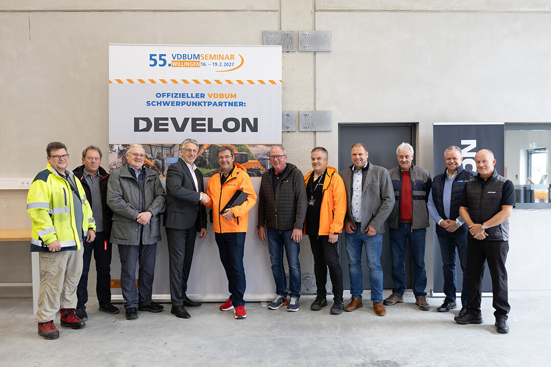 Auch Dieter Schnittjer, Vorstandsmitglied und Geschäftsführer des Verbandes der Baubranche, Umwelt- und Maschinentechnik e.V. (VDBUM) war unter den Gästen. Er wünschte viel Erfolg am neuen Standort und überreichte dem langjährigen Mitglied des Verbandes als besondere Wertschätzung einen Pokal, der umgehend einen Ehrenplatz im Showroom erhielt. Gleichzeitig wurde bekannt gegeben, dass DEVELON ein Schwerpunktpartner des VDBUM Großseminars 2027 sein wird. “Wir werden dort unsere Lösungen mit echtem Mehrwert in den Bereichen Digitales, Effizienz, und Sicherheit thematisieren“, kündigte Lohner an.