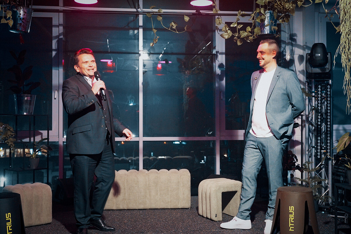 Einen besonderen inhaltlichen Schwerpunkt des Abends bildete das interaktive Talk-Format mit Geschäftsführer Dominik Heinzelmann und Betriebsleiter Jonas Haag, moderiert von Marketing Manager Oliver Flug. In einem offenen und lebendigen Austausch gab die Geschäftsleitung einen tiefen Einblick in die Arbeit von hTRIUS – von der Vision bis zur praktischen Umsetzung im Alltag des Unternehmens. Zudem beantworteten sie Fragen zu Produktentwicklung, Unternehmenskultur, und teilten persönliche Einblicke in die nächsten Schritte der strategischen Weiterentwicklung.