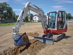 Was manche Minibagger als teure Sonderausrüstung mitbringen, haben andere schon standardmäßig eingebaut – etwa die Maschinen der neuen 200er-Baureihe von Takeuchi: Die drei Minibagger TB 228 (2,8t), TB 235 (3,5t) und TB 250 (4,9t) haben einen hydraulischen Powertilt-Schwenkkopf mit hydraulischem Schnellwechsler von Lehnhoff, an dem bisher starre Anbauwerkzeuge seitlich um nahezu 180° geschwenkt werden können. Werkzeuge mit Symlock-Adapter können auch blitzschnell für den Hochlöffelbetrieb umgedreht werden. Auf diese Weise kann man etwa unzugängliche Fundamente, Rohre und Hindernisse leicht freilegen oder unterschachten. Bequem von der Kabine aus kann man auch andere, hydraulisch aktivierte Werkzeuge anbringen. Zwei freie Zusatz-Hydraulikkreisläufe mit proportionaler Ansteuerung ermöglichen den millimetergenauen Betrieb beispielsweise von Mehrzweck- oder Pendelschaufelgreifern und Pflasterverlegezangen. jz