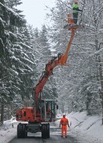 Jahrelang war der Multi-Tele-Star von Paus, eine selbstfahrende Arbeitsbühne auf Basis eines Radladers für den Einmannbetrieb, allein auf dem Markt. Mittlerweile bekam er Gesellschaft durch die Hubarbeitsbühne DTP 1000 von Decker für kompakte Radlader. Die teleskopierbare, nivellierbare und damit einzigartige Anbauplattform mit einer Arbeitshöhe bis 10m und einer Reichweite bis6 m wird am Schnellwechsler eines beliebigen Laders angebaut. Dann muss man noch die Laderhydraulik für den Einsatz ertüchtigen: Kippzylinder arretieren, Rohrbruchsicherung im Hubzylinder einbauen sowie Hub- und Senkgeschwindigkeit drosseln. Danach darf die Arbeitsbühne von der Plattform aus gesteuert werden, den Radlader lenkt der zweite Mann in der Kabine. Mittlerweile hat Decker nachgelegt mit den Modellen DP 800/B und DTP 1000/B für Hydraulikbagger. Je nach Grundmaschine erreichen sie 14 bis 16m Arbeitshöhe und 10 bis 12m Reichweite. Verfahren kann man die Baggerbühne allerdings nur von der Kabine aus.