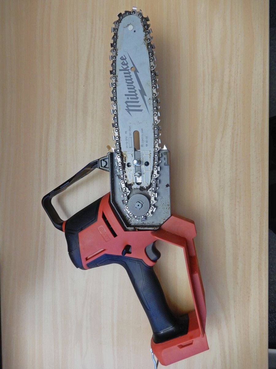 Neben der 3/8“-Hobby-Schneidausrüstung (Milwaukee) in 1,1-mm-Ausführung kommt hauptsächlich die 1/4“-Kettenteilung zum Einsatz. Das ist auch sinnvoll, weil dadurch das Risiko von Rindenbeschädigungen geringer wird. Makita geht mit der DUC 101 dagegen sogar auf 0325“-Kettenteilung.