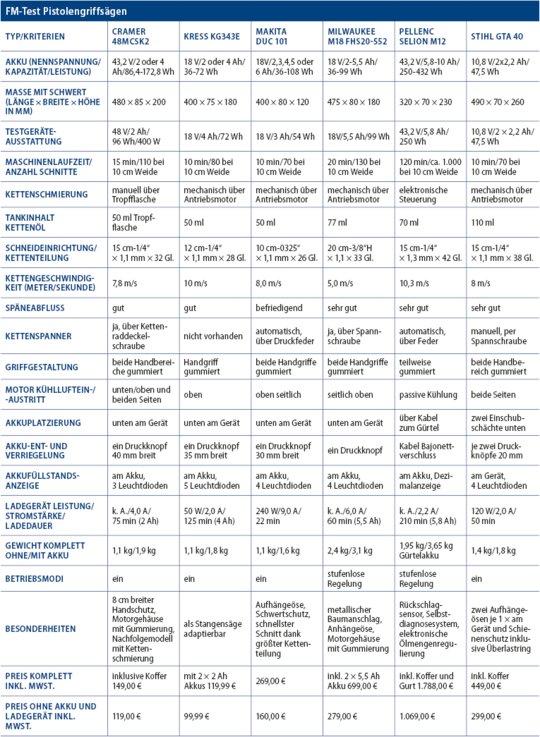 Akkukettensägen mit Pistolengriff sind besonders für die Gehölz- und Baumpflege, zum Beispiel den starken Rückschnitt alter Hecken, den Obst- und Weinbau sowie beim Holzbau von Bedeutung. Aufgrund ihrer kompakten Baumaße sind sie das Bindeglied zwischen Akkuschere und klassischer Baumpflegesäge. Wir haben einige Modelle getestet.