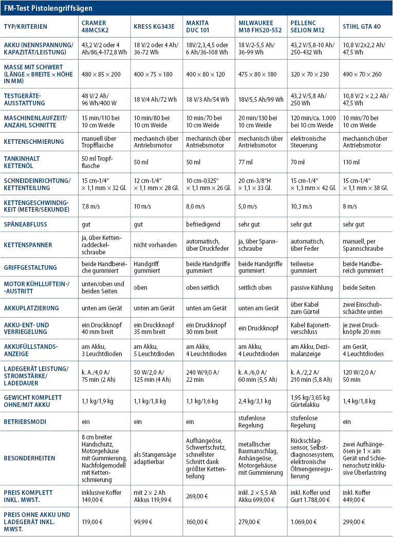 von Ekkehard Musche erschienen am 19.02.2025Neben den altbekannten Marken Pellenc, Stihl und Makita sind mit Cramer, Kress und Milwaukee echte Newcomer in diesem Segment unterwegs. Trotz der geringeren Schnittlängen sollten solche Sägen eine hohe Kettengeschwindigkeit und Durchzugskraft besitzen und entsprechend eine ausgeklügelte Ansteuerung von Motor und Akku in sich tragen. Wir haben folgende Modelle getestet: Cramer 48MCSK2, Kress KG343E, Makita DUC 101, Milwaukee M18 FHS20-552, Pellenc Selion M12 und Stihl GTA 40. Unterschiedliche Holzarten und Durchmesser (Walnuss, Haselnuss und alte Obstbäume) wurden bei diesem Test gekappt und in Scheiben geschnitten. Wie üblich ergeben sich auch wertvolle Hinweise an die Hersteller.