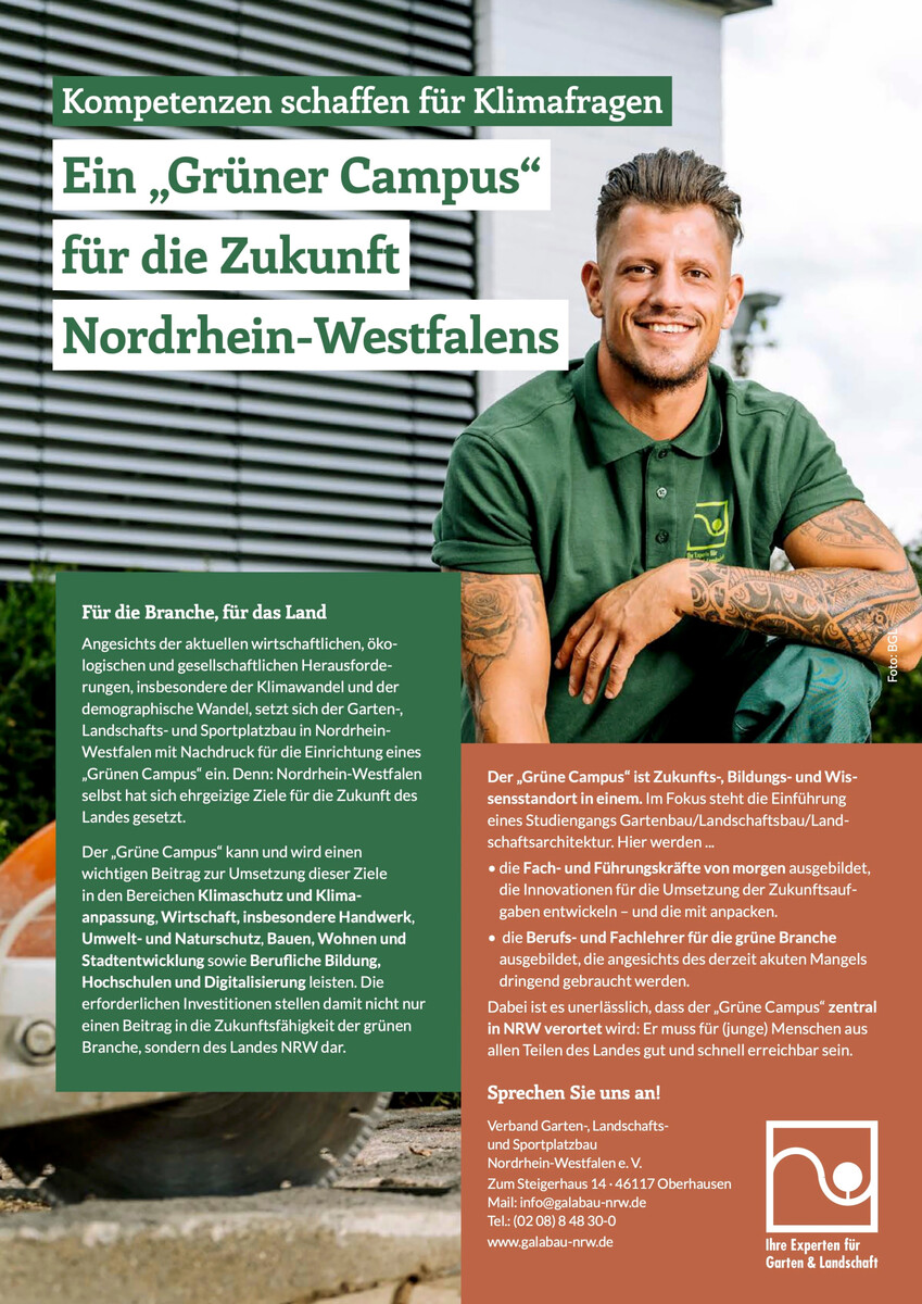 In einem Positionspapier konkretisiert der VGL NRW den Grünen Campus: Zentral und gut erreichbar im Bundesland gelegen, soll dieser Bildungs-, Zukunfts- und Wissensstandort die Fachkräfte von morgen ausbilden und damit Klimaschutz, Klimaanpassung, nachhaltige Stadtentwicklung und Handwerk stärken. Die erforderlichen Investitionen stellten damit nicht nur einen Beitrag in die Zukunftsfähigkeit der grünen Branche, sondern des Landes NRW dar.